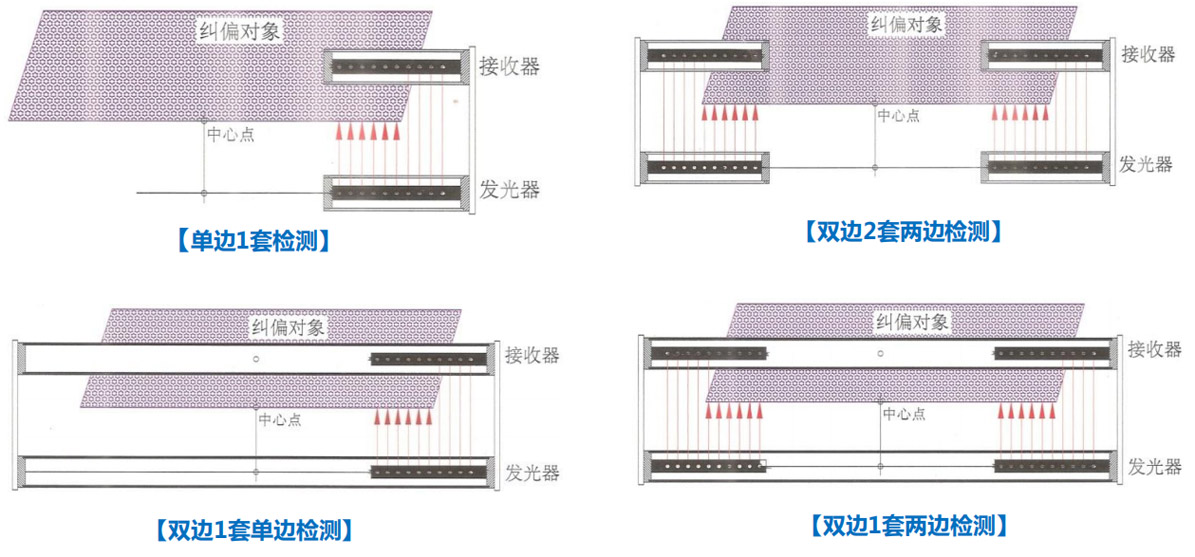 一套糾偏光幕對(duì)一個(gè) 邊進(jìn)行檢測(cè),實(shí)現(xiàn)糾偏效果。