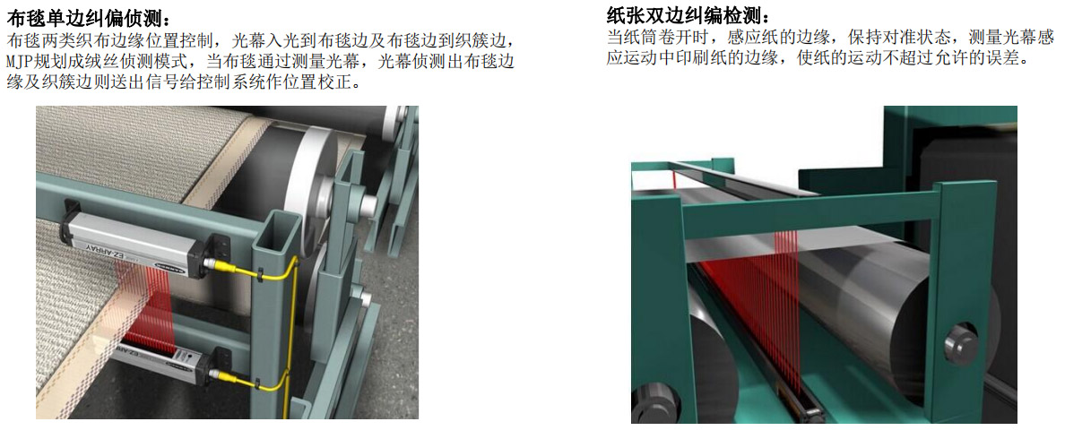 適應(yīng)帶材快速連續(xù)生產(chǎn)以及瓦楞紙等連續(xù)生產(chǎn)設(shè)備和帶材處理設(shè)備中,在帶材無(wú)故障運(yùn)送, 并且卷取時(shí),糾偏光幕會(huì)使邊緣整齊、跑偏矯正,能起到大大減少邊料浪費(fèi)提高產(chǎn)品品質(zhì)。