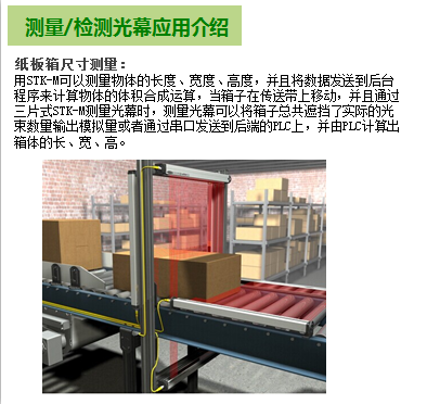 安全光幕系統(tǒng)能自動(dòng)檢測(cè)出輸送機(jī)上通過(guò)的所有物品的重量、體積和標(biāo)識(shí)、運(yùn)行時(shí)無(wú)聲無(wú)光、操作非常簡(jiǎn)單、無(wú)須特別技術(shù)知識(shí)即可操作。物品檢測(cè)結(jié)束后物品的重量、體積和標(biāo)識(shí)等數(shù)據(jù)發(fā)送至電腦終端或通過(guò)標(biāo)準(zhǔn)的通信接口和軟件接口傳輸?shù)狡髽I(yè)物流管理系統(tǒng)。